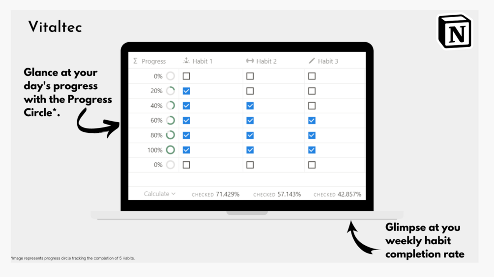 Glance at your day's progress with the progress circle and analyze your weekly habit completion rate.