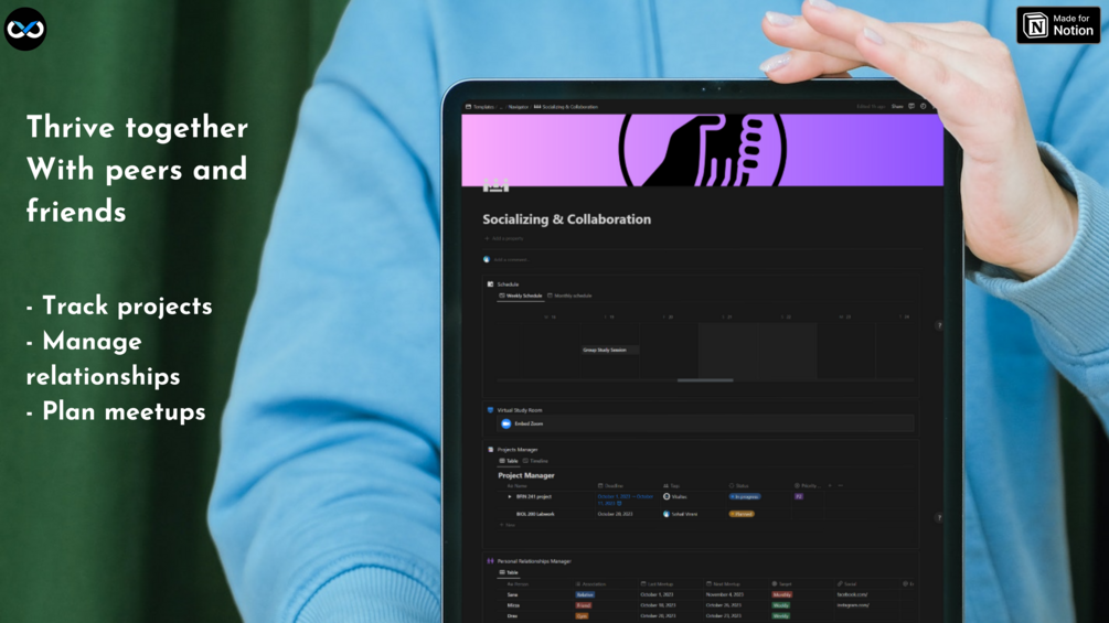 - Socializing & Collaboration: Embed virtual Zoom meetings for seamless interaction, ensuring you're always connected. Utilize the Project Manager to collaborate effectively with your peers. Stay on top of relationships and connections with the Personal CRM, making networking and collaboration a breeze.